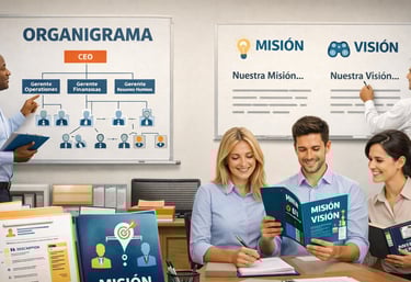 Poner organigrama, perfil de puestos, misión, visión y más.